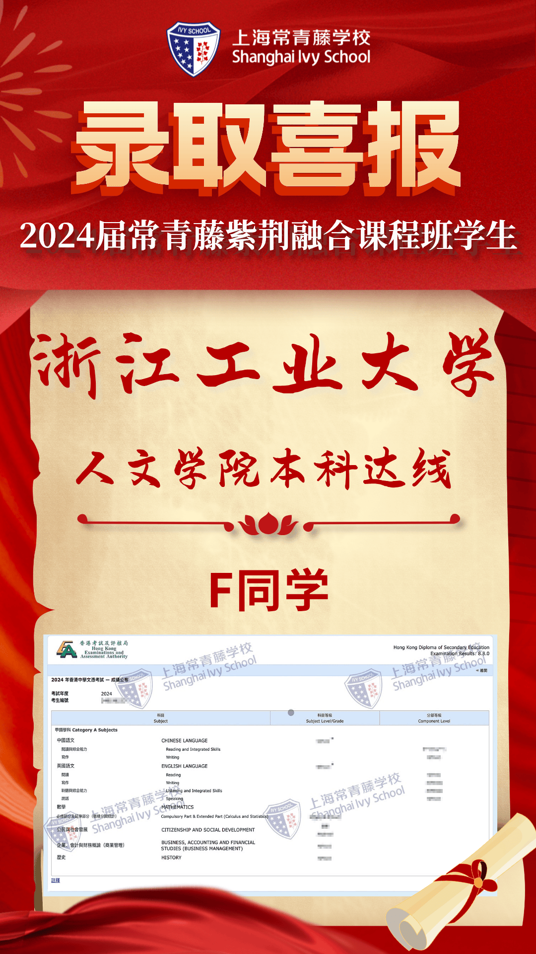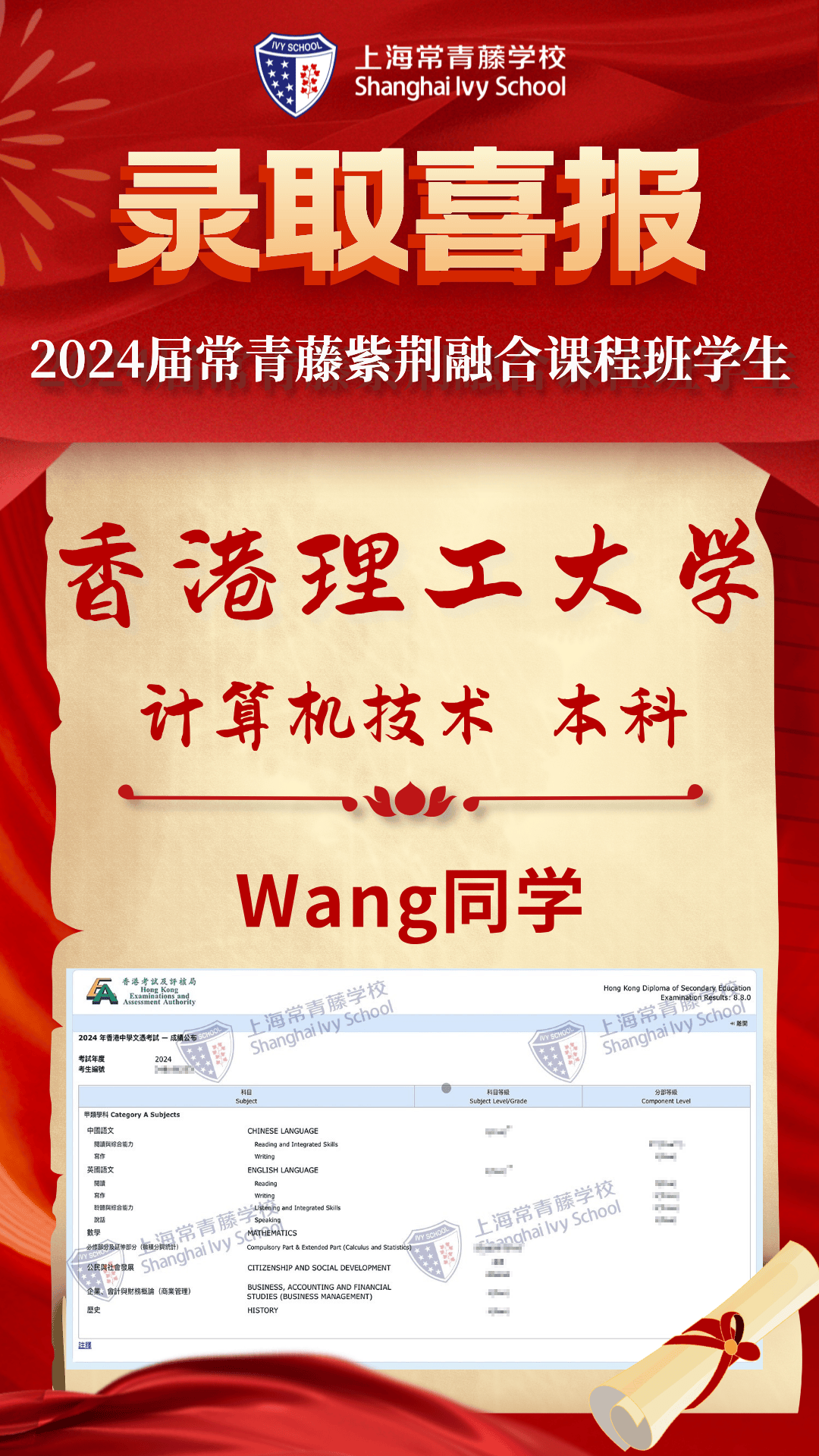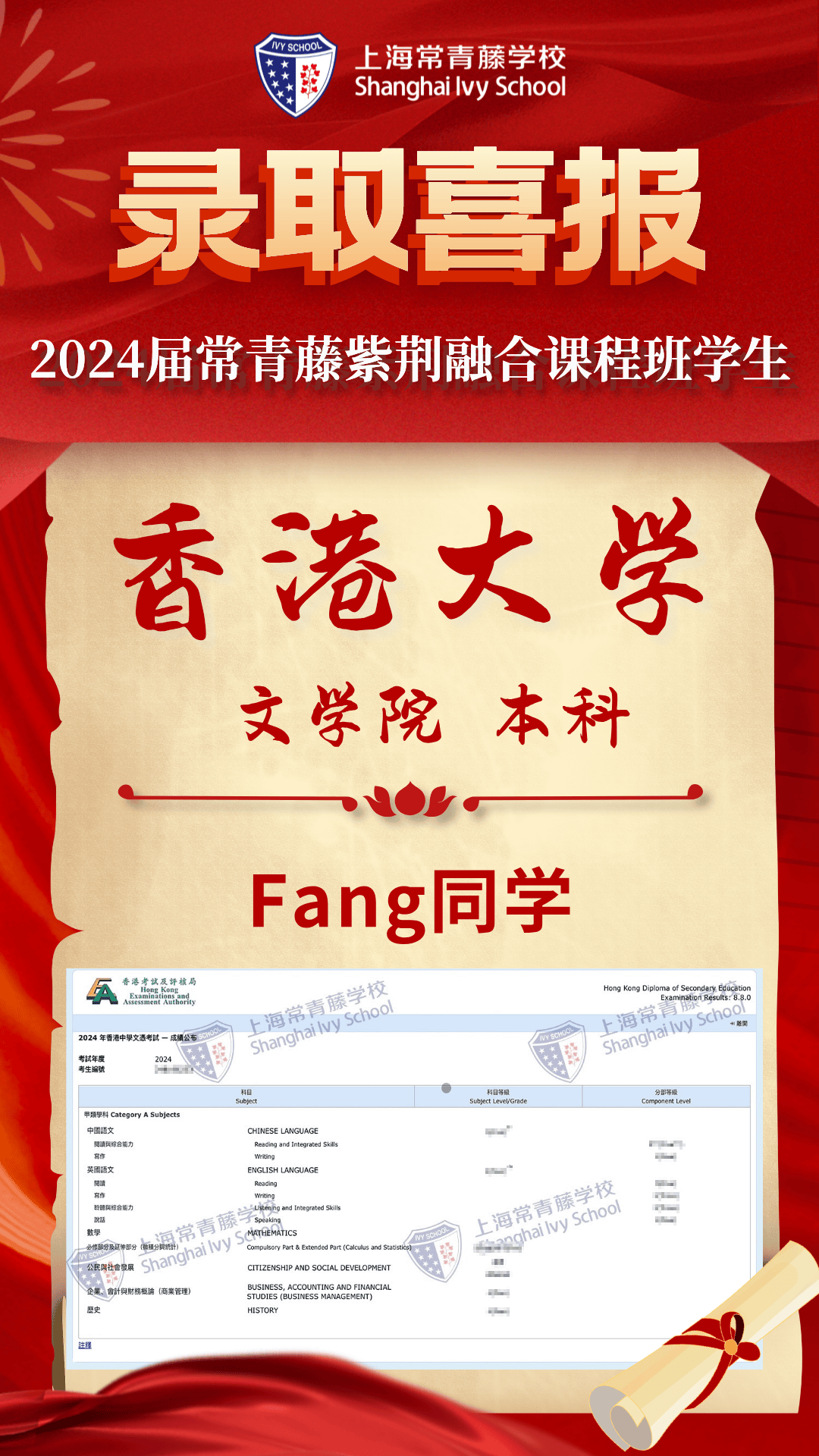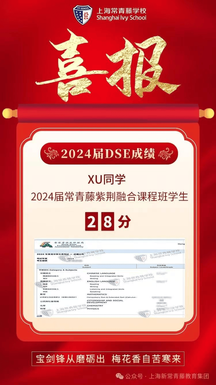 2024屆常青藤學(xué)子4人達(dá)到港前三錄取標(biāo)準(zhǔn),7人過線港八大,超60%學(xué)子成績(jī)達(dá)到QS世界大學(xué)排名前50高校錄取要求和港八大錄取要求,70%達(dá)到香港本科錄取要求(香港全體考生為39%)。祝賀 1名同學(xué)數(shù)學(xué)(位列全港前6%)、M1(位列全港前12.3%)、物理(位列全港前11.3%)達(dá)到 三科5*,4名同學(xué)數(shù)學(xué)5分(位列全港前15.4%),3名同學(xué) M1/M2數(shù)學(xué)5分(位列全港前29.5%)、3名同學(xué)物理5分(位列全港前28.2%),3名同學(xué)語文5分(位列全港前10.5 %),公民社會(huì)合格率100%,1名同學(xué)化學(xué)5分(位列全港前26.8%),5名同學(xué)英語4分(位列全港前28.7%),1名同學(xué)歷史4分(位列全港前45.6%)、1名同學(xué)企業(yè)會(huì)計(jì)財(cái)務(wù)4分(位列全港前31.3%),展現(xiàn)了學(xué)子非凡的學(xué)術(shù)實(shí)力與潛力。