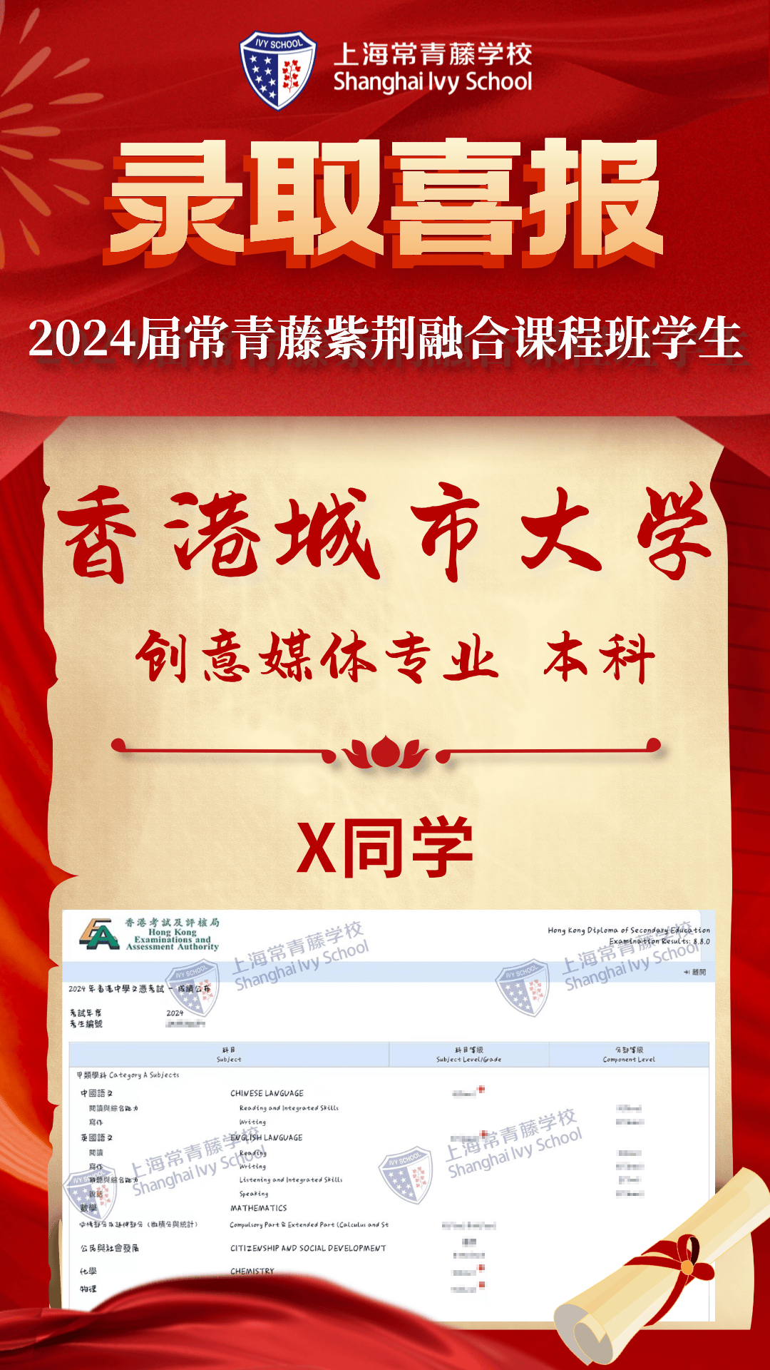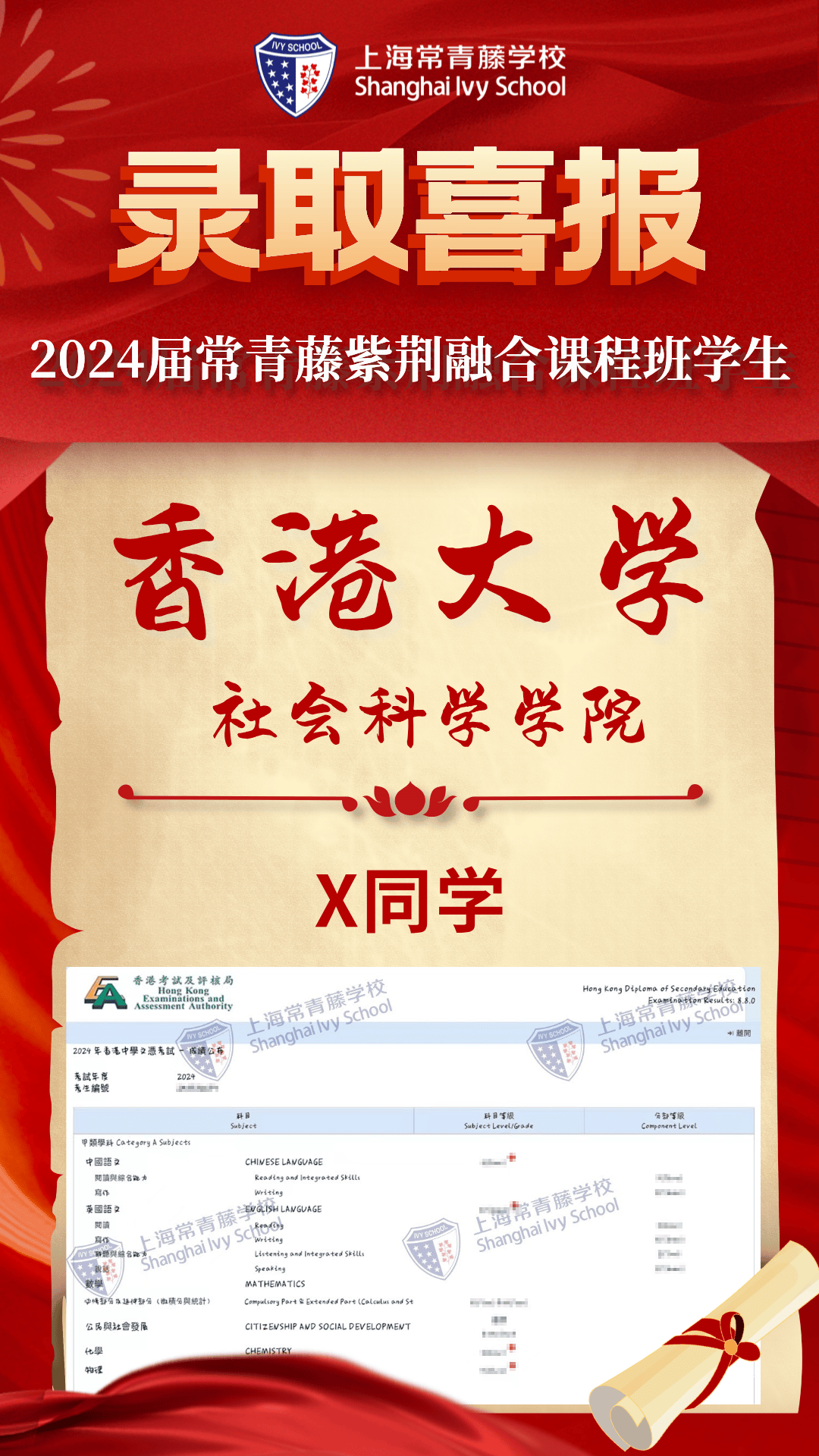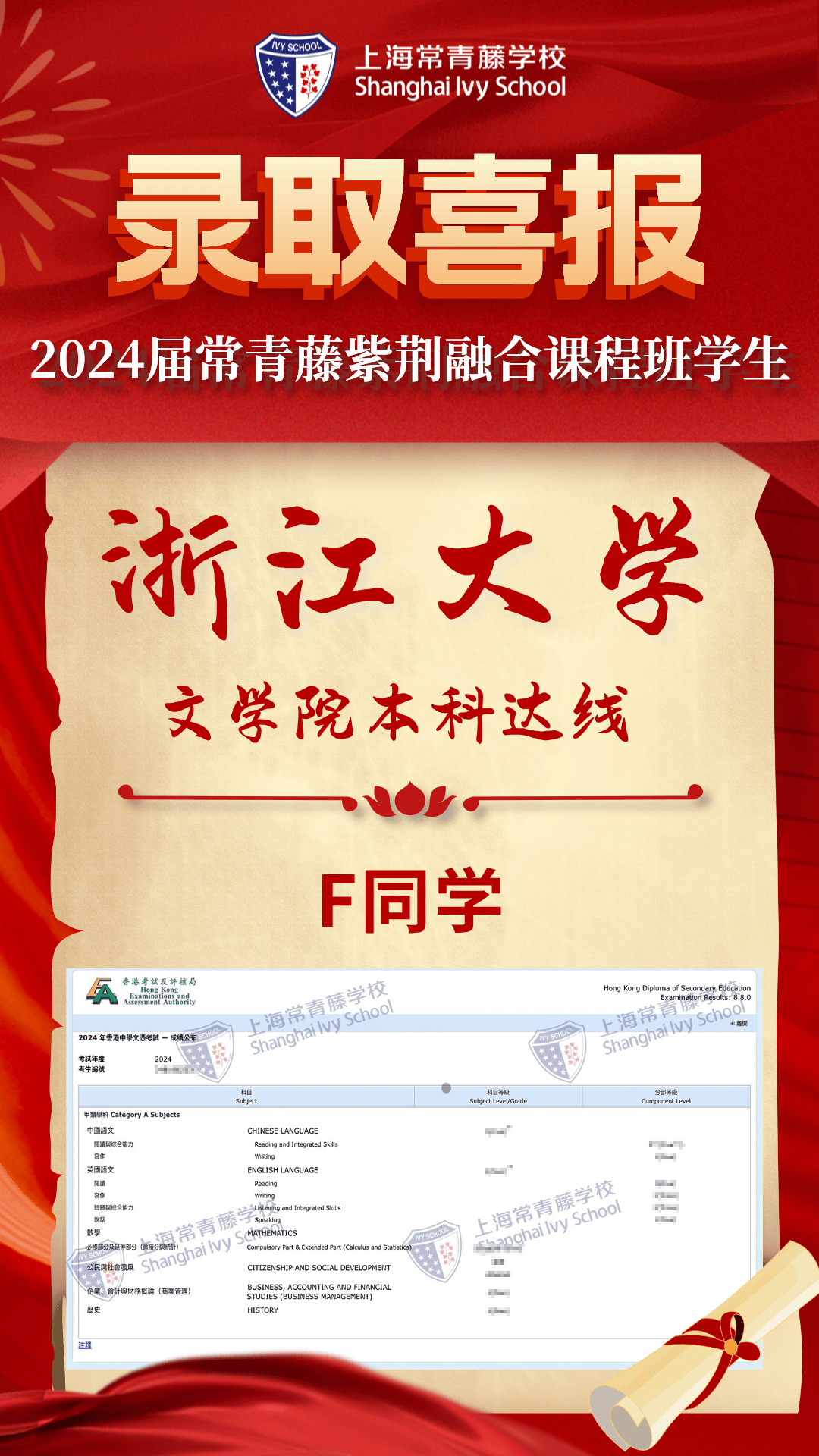 2024屆常青藤學(xué)子4人達(dá)到港前三錄取標(biāo)準(zhǔn),7人過線港八大,超60%學(xué)子成績(jī)達(dá)到QS世界大學(xué)排名前50高校錄取要求和港八大錄取要求,70%達(dá)到香港本科錄取要求(香港全體考生為39%)。祝賀 1名同學(xué)數(shù)學(xué)(位列全港前6%)、M1(位列全港前12.3%)、物理(位列全港前11.3%)達(dá)到 三科5*,4名同學(xué)數(shù)學(xué)5分(位列全港前15.4%),3名同學(xué) M1/M2數(shù)學(xué)5分(位列全港前29.5%)、3名同學(xué)物理5分(位列全港前28.2%),3名同學(xué)語文5分(位列全港前10.5 %),公民社會(huì)合格率100%,1名同學(xué)化學(xué)5分(位列全港前26.8%),5名同學(xué)英語4分(位列全港前28.7%),1名同學(xué)歷史4分(位列全港前45.6%)、1名同學(xué)企業(yè)會(huì)計(jì)財(cái)務(wù)4分(位列全港前31.3%),展現(xiàn)了學(xué)子非凡的學(xué)術(shù)實(shí)力與潛力。