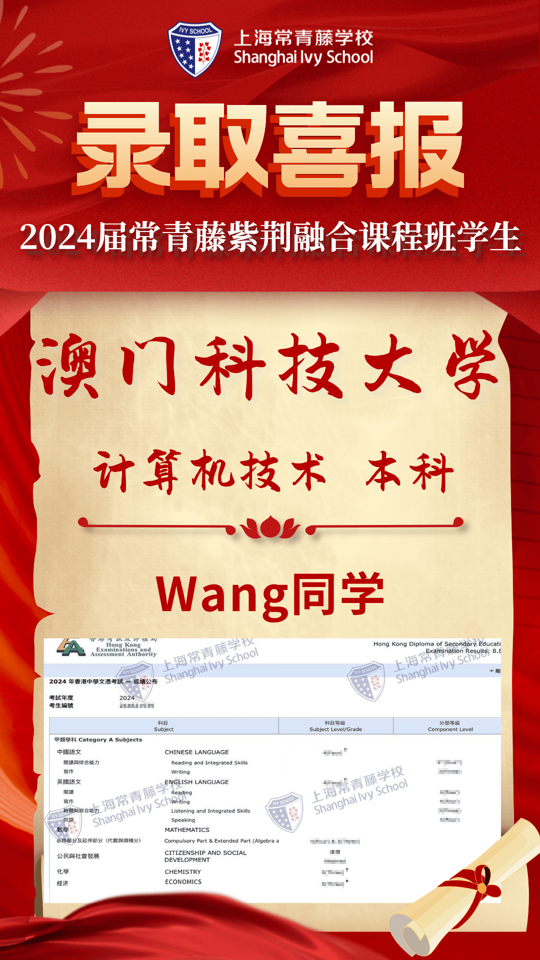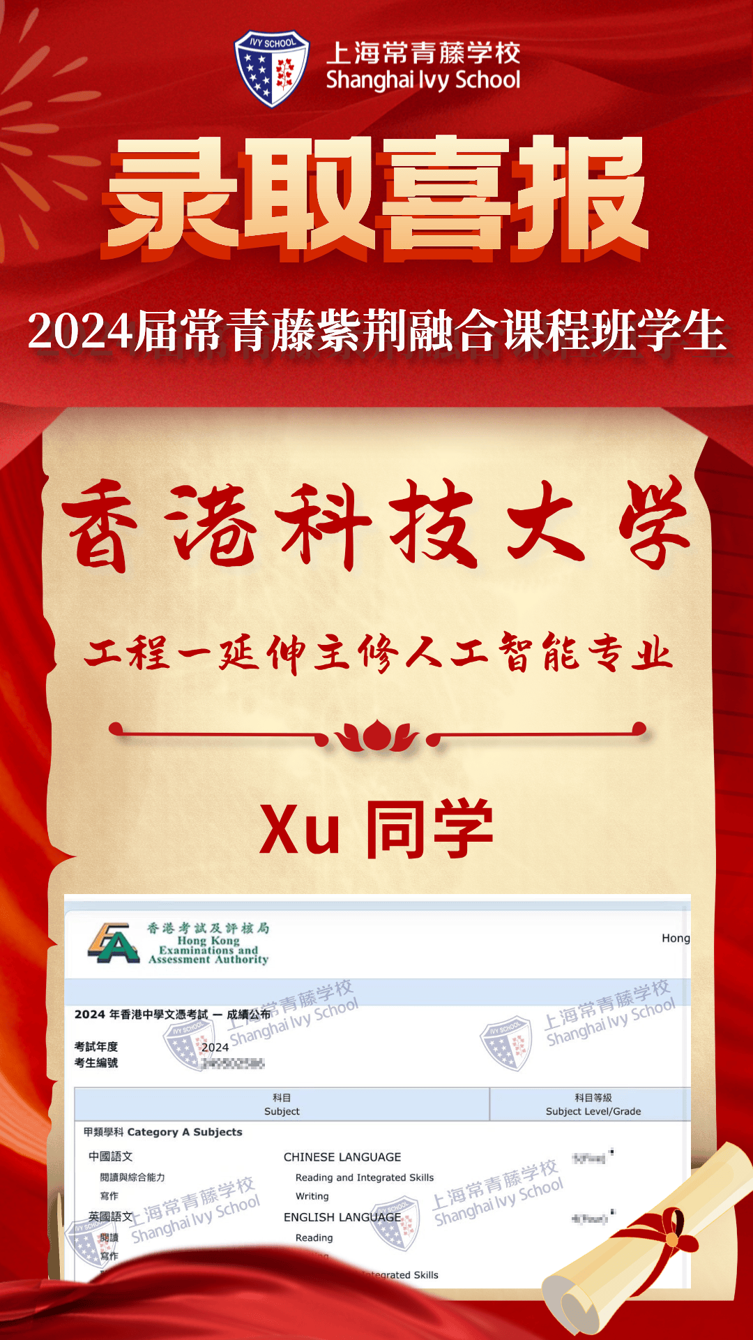我校Fang同學(xué),Kong同學(xué)、 X同學(xué),這三位畢業(yè)生成功獲得了香港大學(xué)文學(xué)院、香港大學(xué)理學(xué)院、香港大學(xué)社會(huì)科學(xué)學(xué)院的本科專業(yè)正式錄?。晃倚?strong>Xu同學(xué)獲得了香港科技大學(xué)的工程人工智能專業(yè)本科正式錄?。晃倚?strong>Chen同學(xué)獲得了香港城市大學(xué)的創(chuàng)意媒體專業(yè)本科錄?。晃倚?strong>Wang同學(xué)獲得了香港理工大學(xué)的計(jì)算機(jī)專業(yè)錄??;Wang同學(xué)獲得了香港浸會(huì)大學(xué)理學(xué)院本科錄?。?strong>Li同學(xué)和Wang同學(xué)獲得了香港都會(huì)大學(xué)的計(jì)算機(jī)技術(shù)和金融科技專業(yè)本科錄??;Wang同學(xué)獲得了澳門科技大學(xué)的計(jì)算機(jī)本科錄取。
