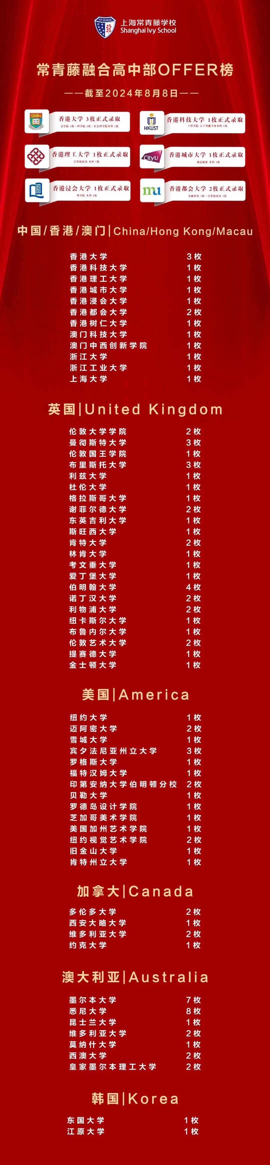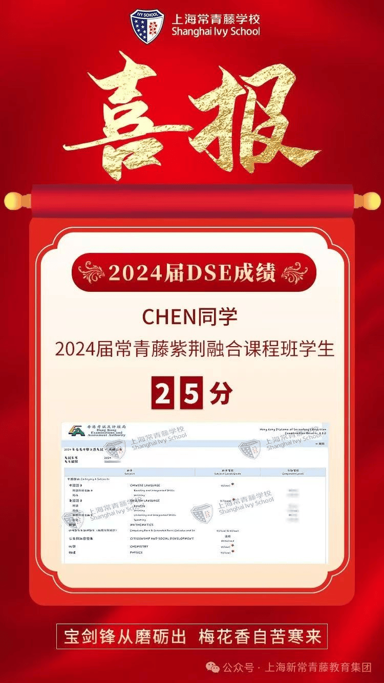 2024屆 DSE申請(qǐng)錄取季已基本落下帷幕,上海常青藤學(xué)校2024屆紫荊融合課程班畢業(yè)生升學(xué)成果再迎新突破!自2013年建校以來,上海常青藤學(xué)校已有8屆美高 AP課程畢業(yè)生,升學(xué)成果節(jié)節(jié)攀升,自2020年上海首批開設(shè)亞洲高考 HKDSE和EJU課程來,截至今年8月,常青藤紫荊 DSE學(xué)子們收獲了來自中國(guó)香港澳門、內(nèi)地重點(diǎn)高校、英聯(lián)邦英國(guó)、澳大利亞、加拿大等國(guó)家和地區(qū)的多封大學(xué)錄取信,名校橄欖枝,紛至沓來!