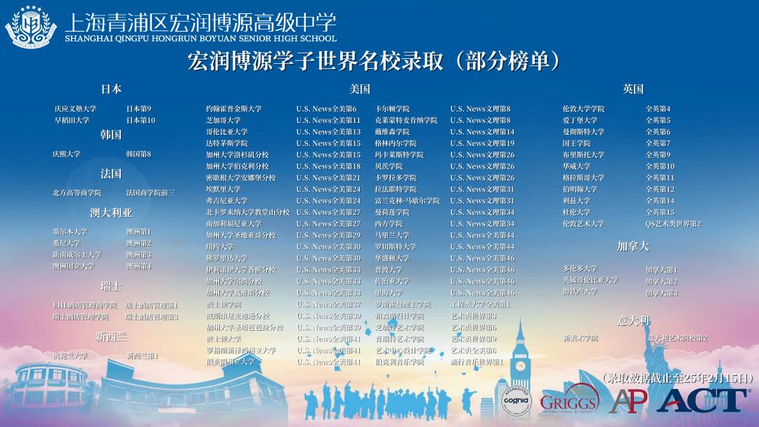 宏潤博源畢業(yè)生,收到包括美國、英國、澳洲、加拿大、新西蘭、日本等國家和地區(qū)的頂尖大學(xué)offer。申錄方向和專業(yè)多元化,涵蓋人文、社科、商科、理工、計(jì)算機(jī)、藝術(shù)和體育等專業(yè)領(lǐng)域。其中45%的同學(xué)獲得US News美國/世界前50大學(xué)、QS世界大學(xué)前50的錄取。在今年申請(qǐng)異常激烈的情況下,宏潤學(xué)子選擇勇攀高峰,不畏艱難。80%的學(xué)生選擇多國聯(lián)申,并取得喜人成績。所獲獎(jiǎng)學(xué)金累計(jì)高達(dá)290萬人民幣。